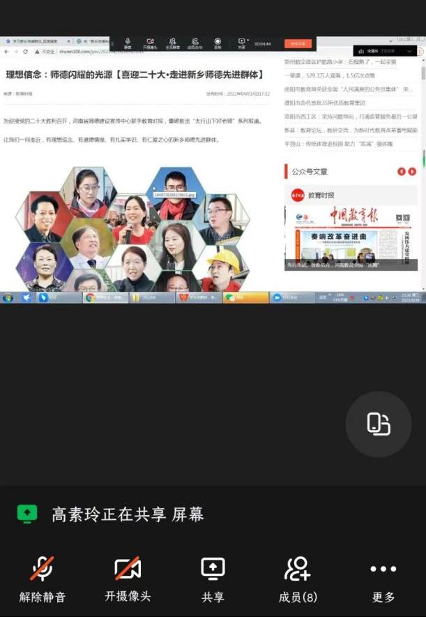 9月28日下午,电子信息工程教研室党支部通过线上钉钉视频会议,开展“学先进群体,争做‘四有’好老师”主题党日活动。党支部副书记高素玲主持会议,党总支书记李红安以普通党员身份参加会议。