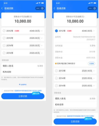 完成上述动作后,家长在国开行小程序在线还款页面输入贷款人的姓名和身份证号,即可帮助贷款人进行还款。