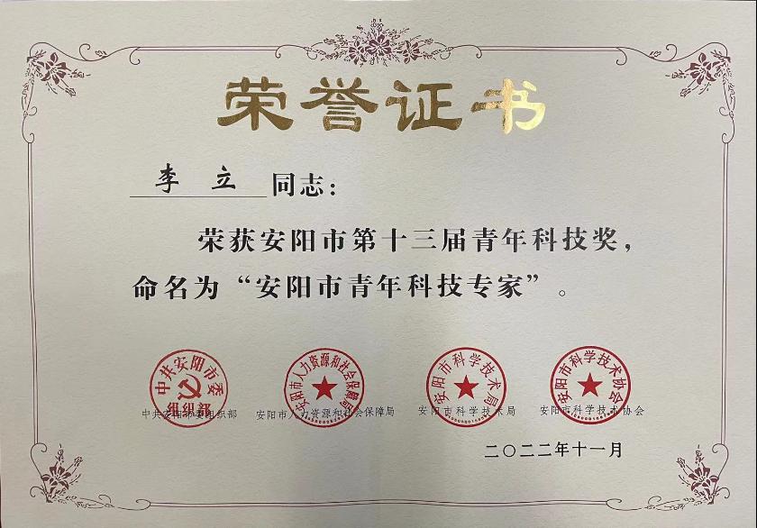 根据《安阳市青年科技奖评选管理办法》,经专家评审、市青年科技奖领导工作委员会审批,公布了第十三届青年科技奖评选结果。公司教师李立当选为2022年安阳市青年科技专家。是公司人才队伍建设取得的新进展。