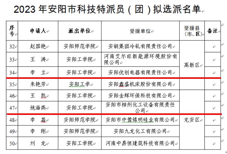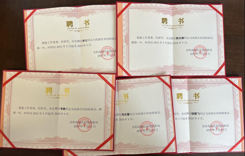 5月25日,根据《关于开展2023年度安阳市科技特派员选派工作的通知》(安科〔2023〕13号)要求,经受援对象发布科技需求、科技人员对接申报、县(市、区)科技主管部门审核推荐、征求相关部门意见等程序,公司李立、姚海燕获批2023年度安阳市科技特派员;李静(团队)获批高新区科技特派员(团)。