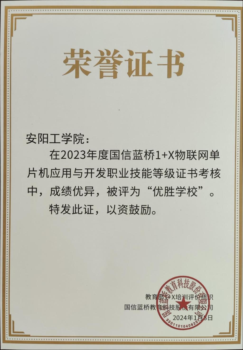 近日,公司被教育部1+X培训评价组织国信蓝桥教育科技股份有限公司评选为2023年度国信蓝桥“1+X”物联网单片机应用与开发职业技能等级证书“优秀组织单位”和“优胜公司”,公司高素玲老师和李小芹老师获得“优秀指导教师”称号。